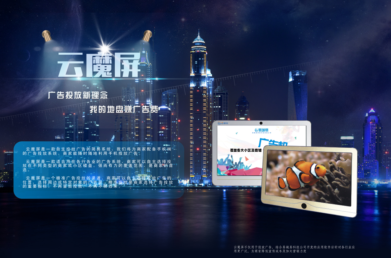 易城易云魔屏+是互聯(lián)網(wǎng)+傳媒+智能硬件與軟件的科技。專注打造“互動媒體+廣告”的新媒體平臺,以做為應(yīng)用場景,增加商家的宣傳價值、開創(chuàng)互聯(lián)網(wǎng)互動媒體新局面。